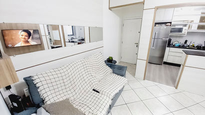 Apartamento de 1 dormitório, transformado em dois quartos, com 55 m² privativos, possui cômodos espaçosos, ótima iluminação e arejamento, aberturas amplas e será entregue totalmente mobiliado e equipado. Cozinha com planejados no conceito aberto com eletros, sala para ambiente social com sofá, rack, painel e TV, além dos detalhes decorativos apresentados nas imagens. Dormitório de solteiro com cama tripla, colchões, armários aéreos e bancada de estudo/trabalho.